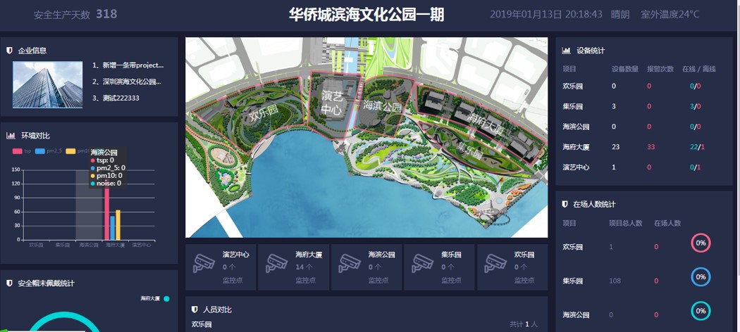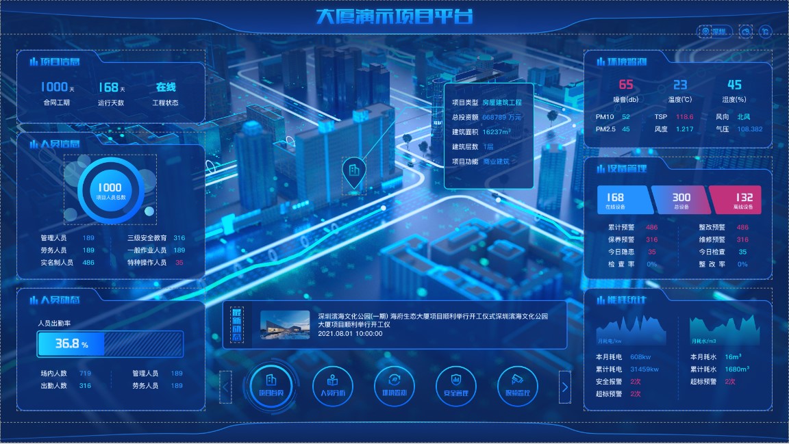 平台将所有子系统数据汇聚,形成企业级或项目级的总控指挥中心。通过一块大屏,管理者即可实时掌控全局:直观展示工程进度与设备位置;可对关键施工工序进行模拟推演,提前优化方案。极端气候预警、供应链风险等信息也能实时呈现,为防灾部署和资源调配提供决策支持。